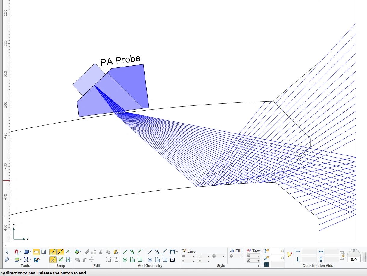 We can generate advanced ultrasonic and phased array scan plans that determines the focal laws for complex components and weld configurations using the eclipse scientific Beamtool ultrasonic modelling software . The software allows for probe parameters to be manipulated on an imported scale drawing of the component.